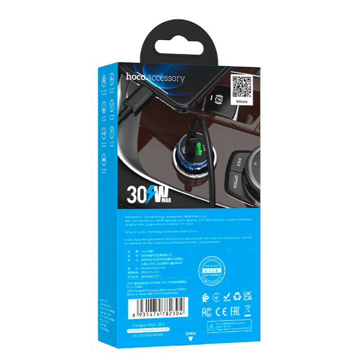 hoco. Зарядное устройство а/м 12V -> USB 5V hoco Z47A, Type-C 30W/USB 18W, PD30W, QC 3.0, + кабель Type-C -> Lightning, прозр. синее