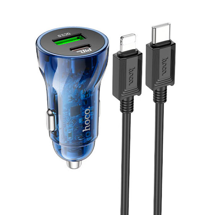 Зарядное устройство а/м 12V -> USB 5V hoco Z47A, Type-C 30W/USB 18W, PD30W, QC 3.0, + кабель Type-C -> Lightning, прозр. синее