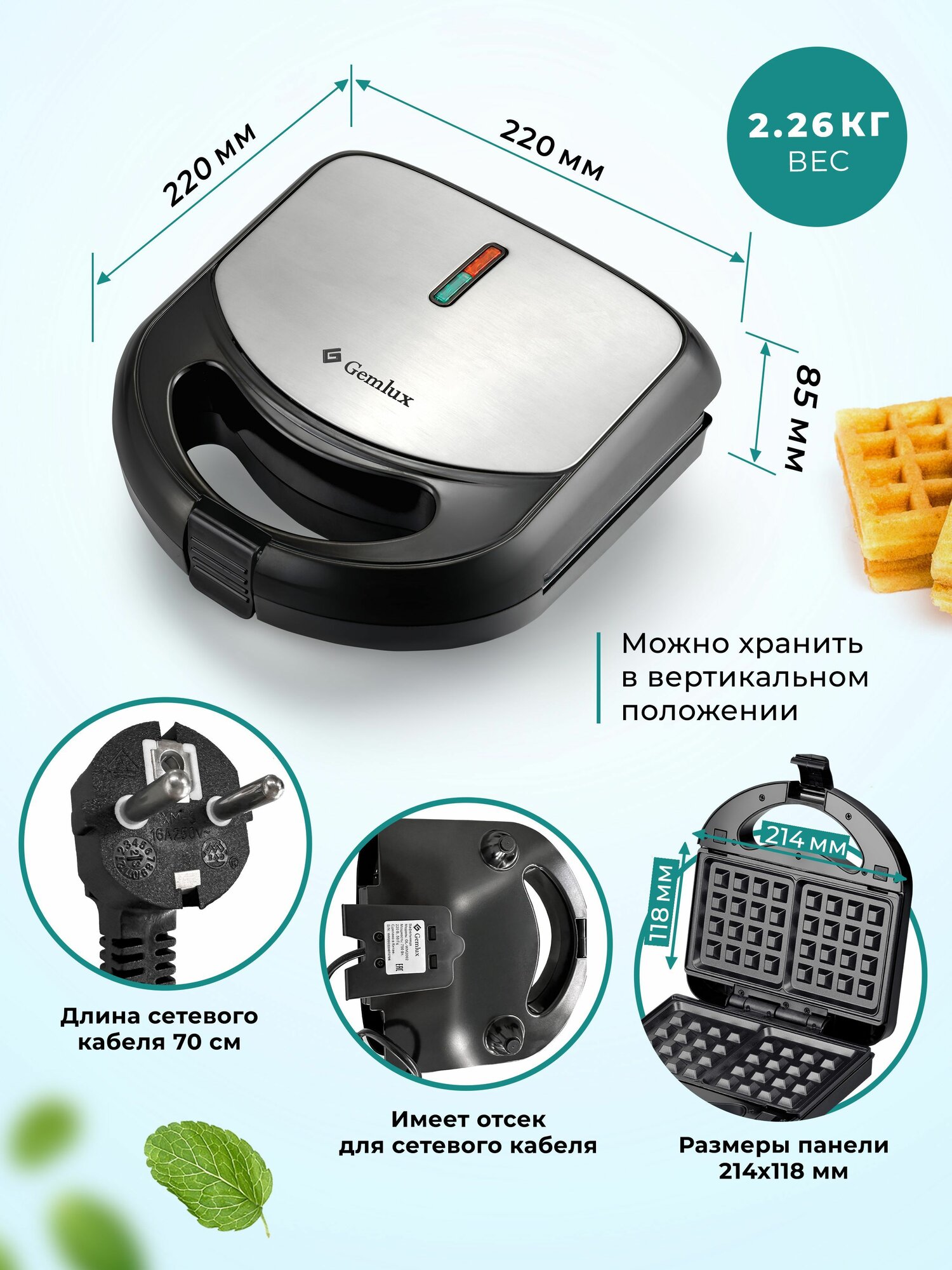 Вафельница электрическая Gemlux GL-WM849 с антипригарным покрытием, мини электровафельница для венских, бельгийских, толстых вафель, бытовая техника для кухни
