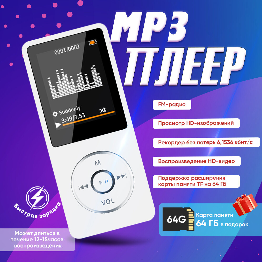 MP3-плееры Беспроводной MP3-плеер 64 ГБ с Bluetooth, наушниками, экраном и FM-радио, белый