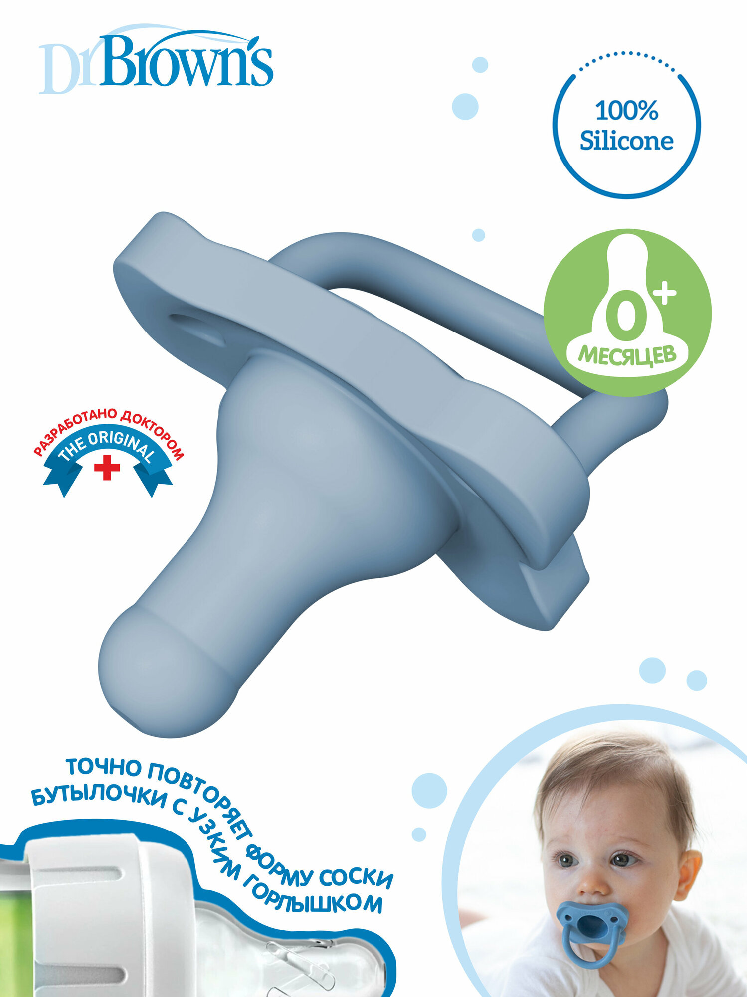 Соски и пустышки Dr. Brown's Цельносиликоновая соска-пустышка 0m+ Голубая