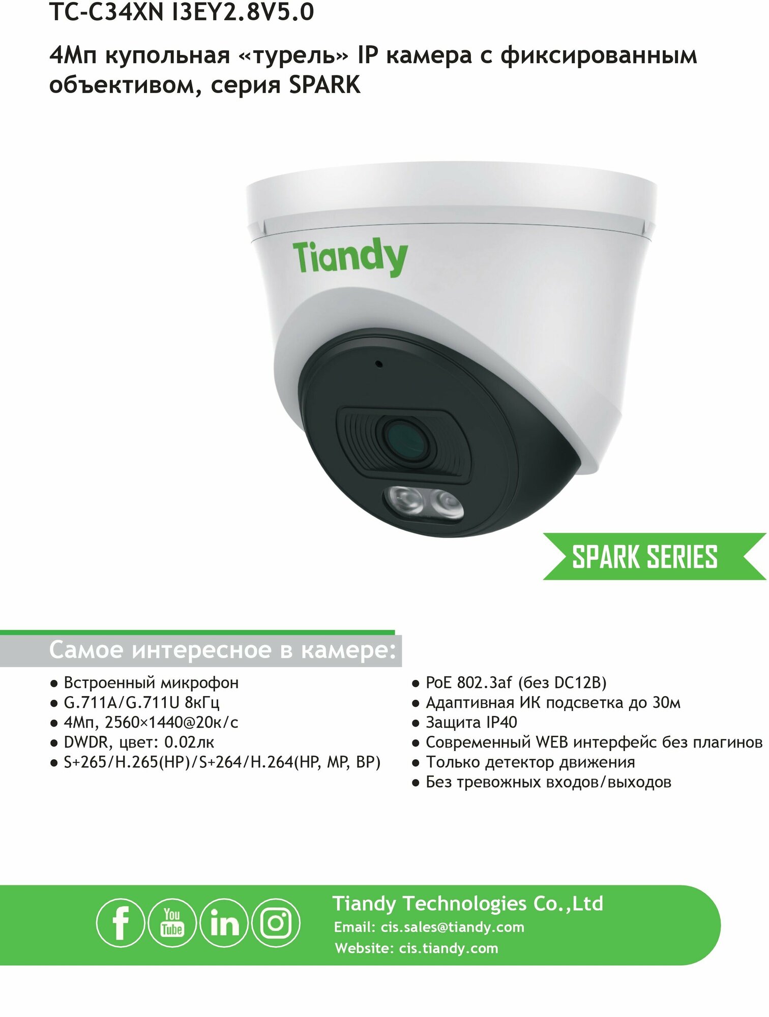 Камеры видеонаблюдения Камера видеонаблюдения IP Tiandy Tc-c34xn I3/E/Y/2.8mm-V5.0 Tc-c34xn I3/E/Y/2.8mm-V5.0