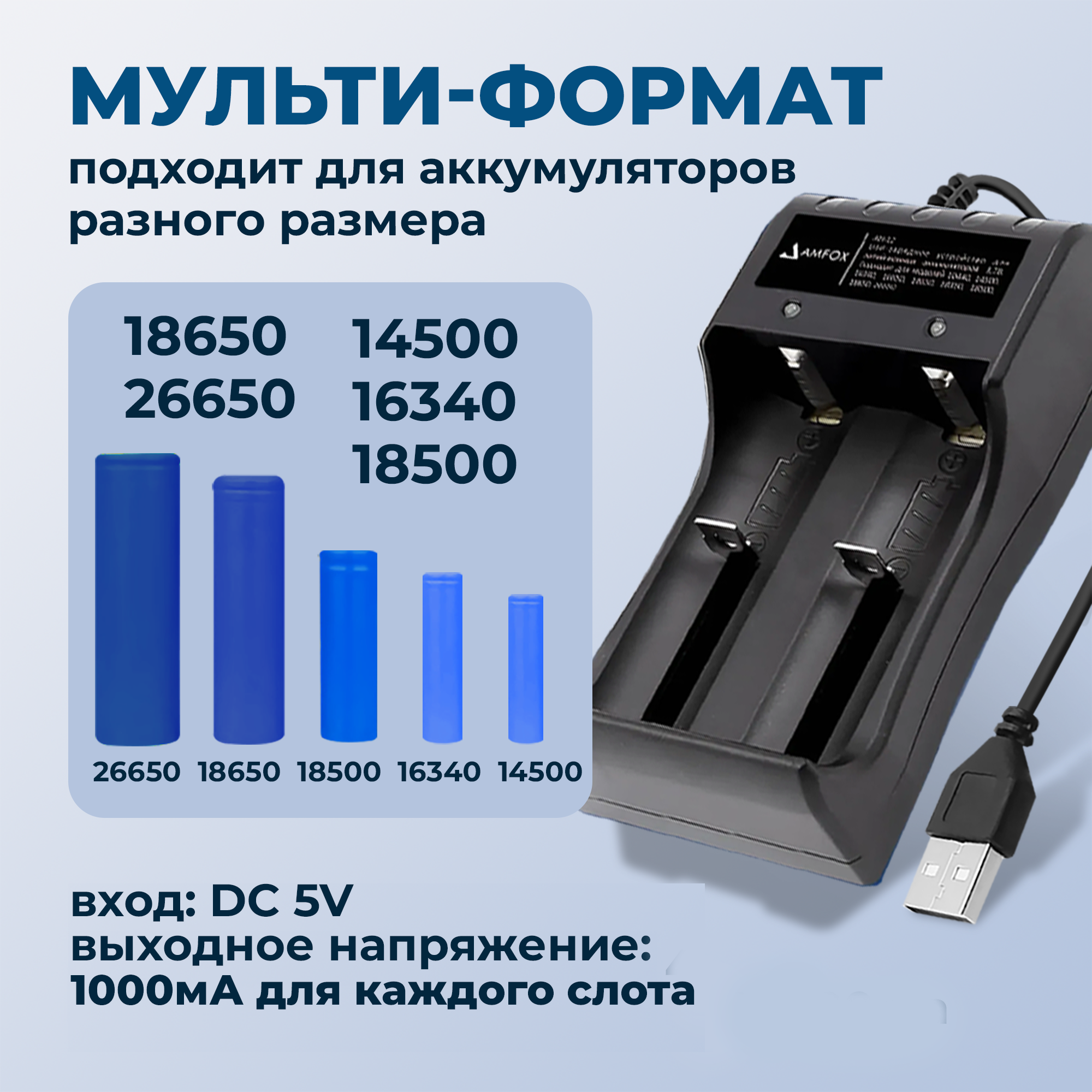 | Типоразмеры | 14500 / 16340 (CR123) / 18650 / 21700 / 26650 / 32650 |