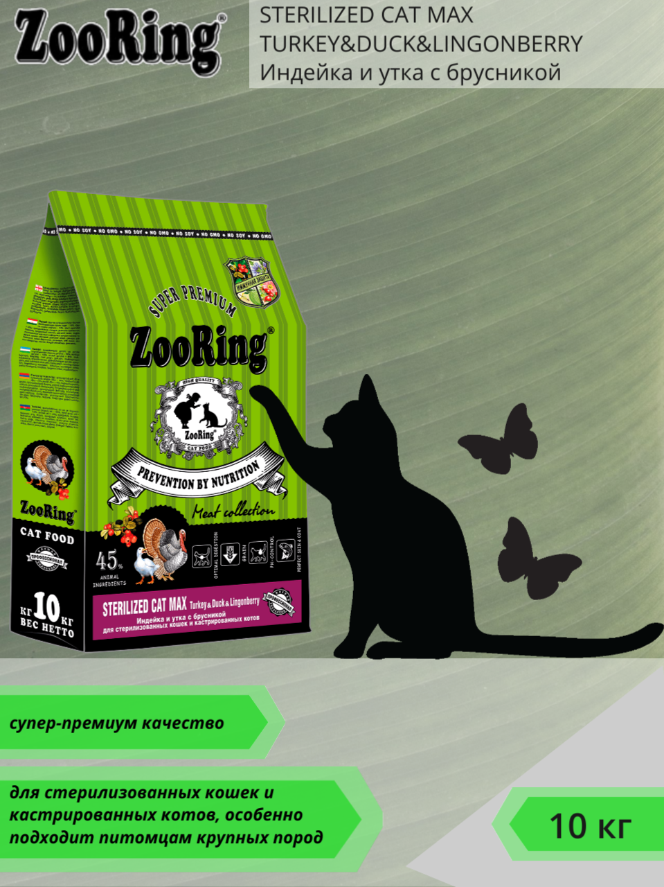 Корм для кошек Сухой корм для стерилизованных кошек Зооринг ZooRing Sterilized Cat Max с индейкой, уткой и брусникой 10 кг