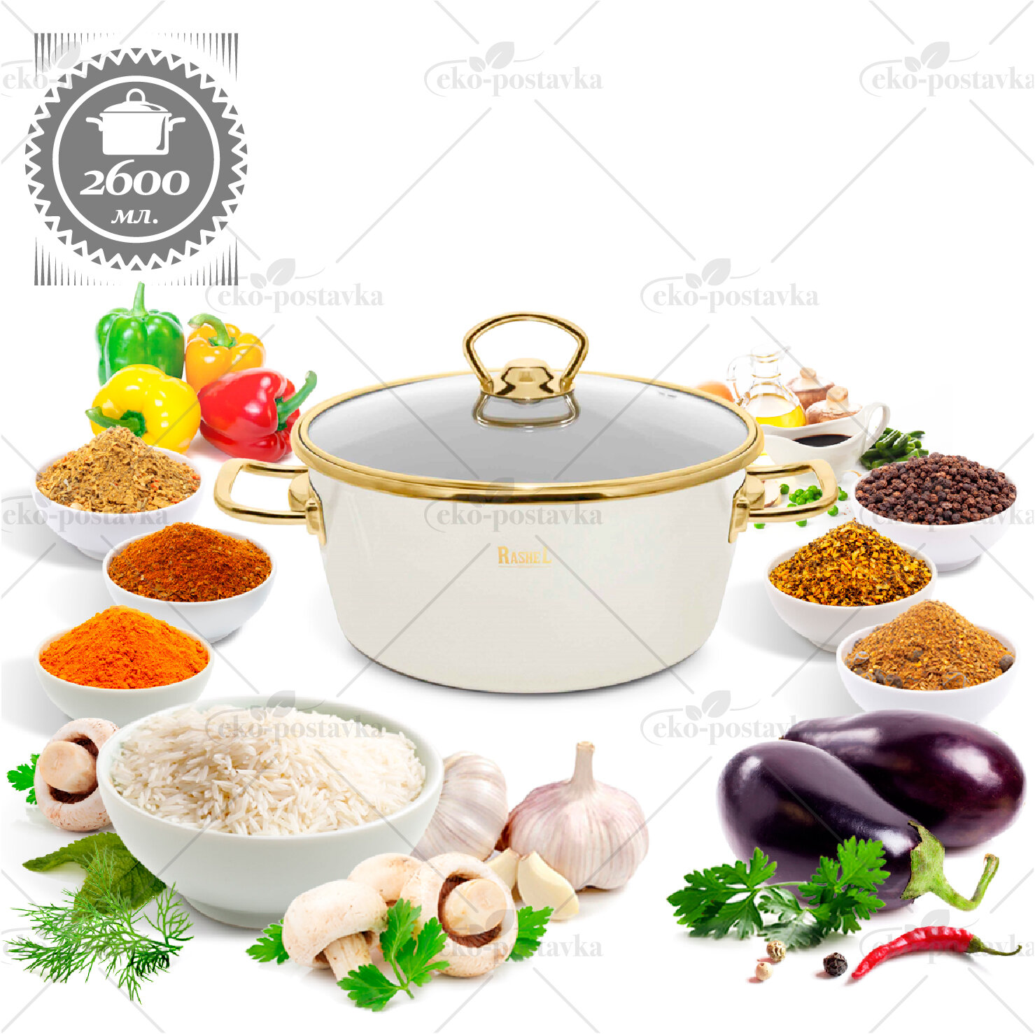Кастрюли Кастрюля 2,6л Rashel Grand R0920 эмаль, ст.крышка, ручка золото; кремовый, индукция