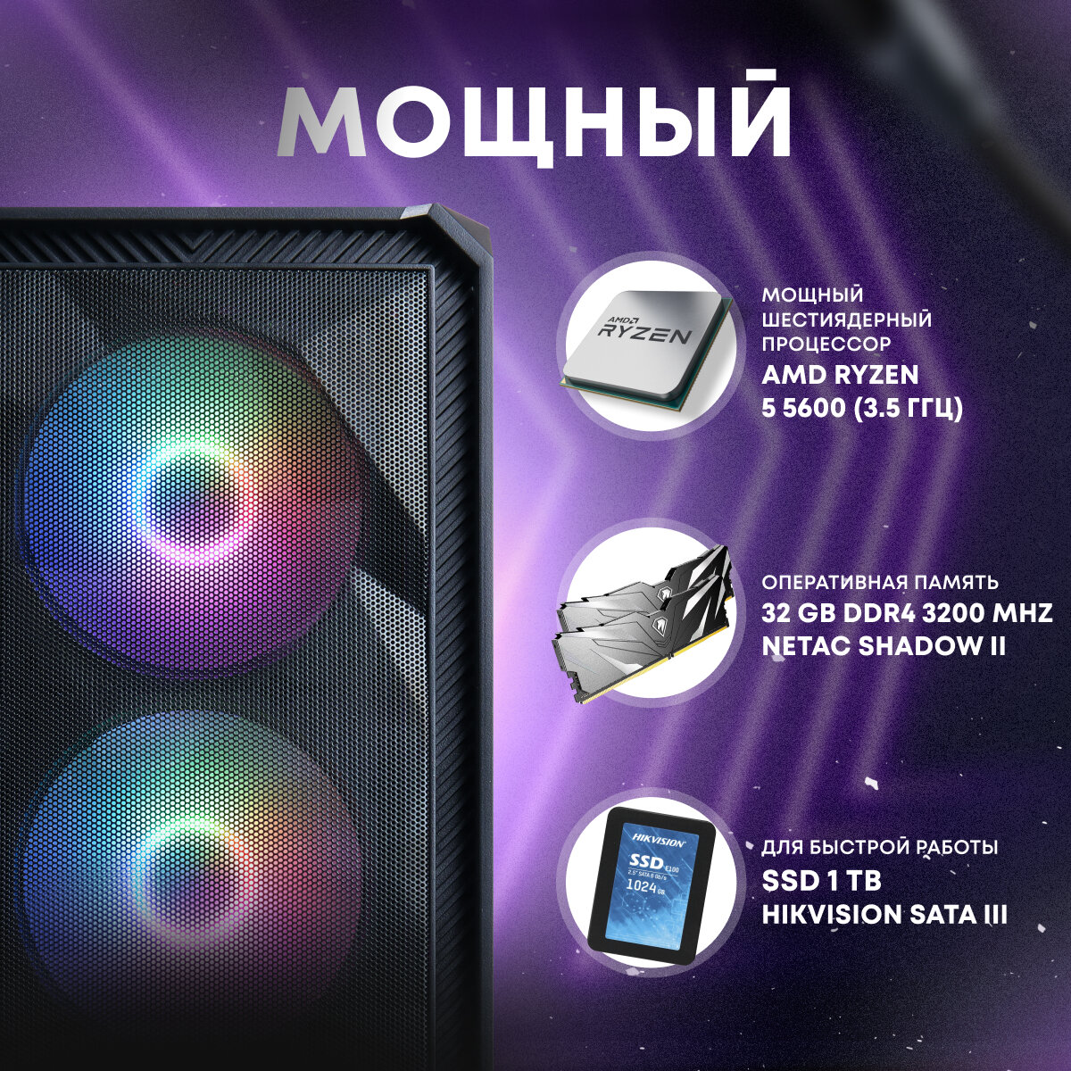 Системный блок игровой мощный для компьютера ПК (RYZEN 5 5600, RX 580 8ГБ, ОЗУ 32ГБ, SSD 1024ГБ) 56 172 ₽ Подробнее