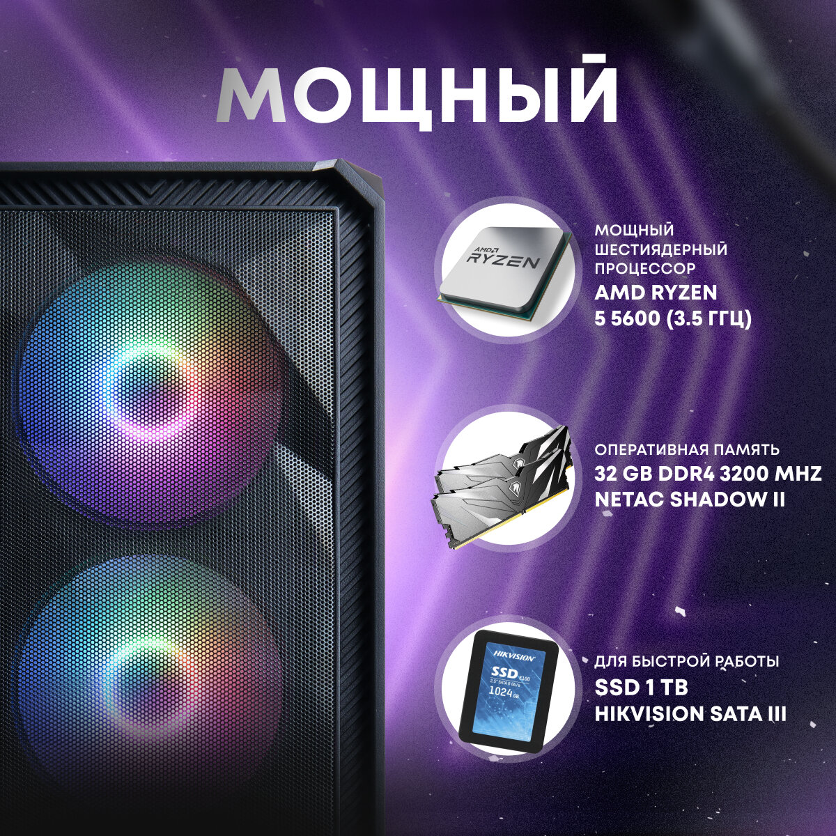 Системный блок игровой мощный для компьютера ПК (RYZEN 5 5600, RX 580 8ГБ, ОЗУ 32ГБ, SSD 1024ГБ) 56 172 ₽ Подробнее