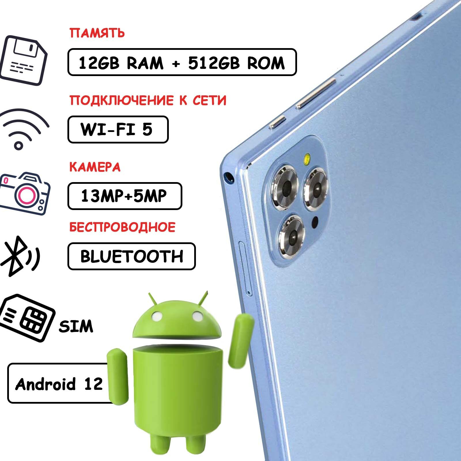 Планшеты Планшет с клавиатурой VANWIN Pad 5 Air 10.1" ,512GB , планшет андроид стилусом голубой