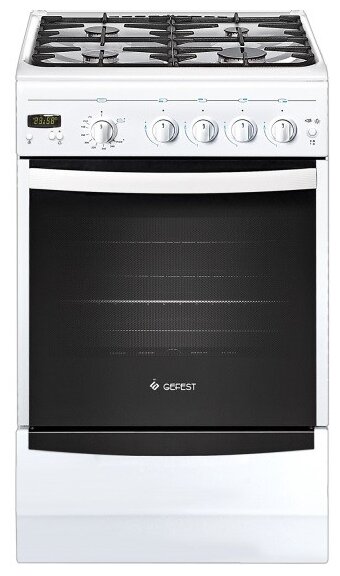 Плита газовая GEFEST 5100-03 /БЕЛ., крышка, подсв., автоматич.розж.,тайм, часы, гриль, верт.,г/к дух.,чуг. решетки/