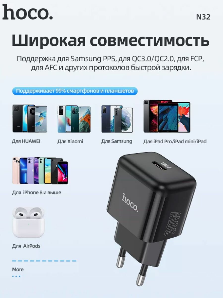 Сетевое зарядное устройство Hoco N32, 1 Type-C, 30 Вт, PD + QC, чёрное Hoco 9881651 . 1 936 ₽ Подробнее