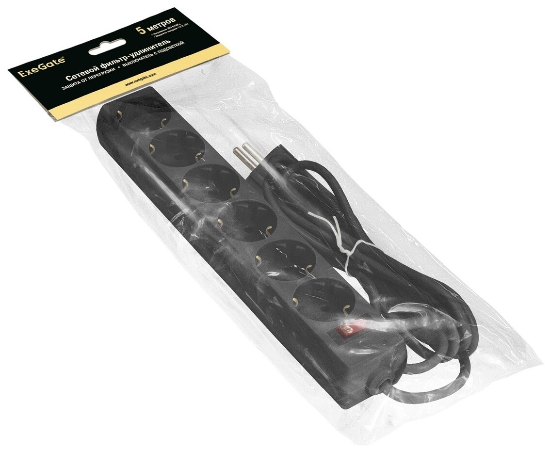 Сетевой фильтр ExeGate SP-6-5B (6 евророзетки с заземлением, 5м, защита от перегрузки, выключатель с подсветкой, черный)