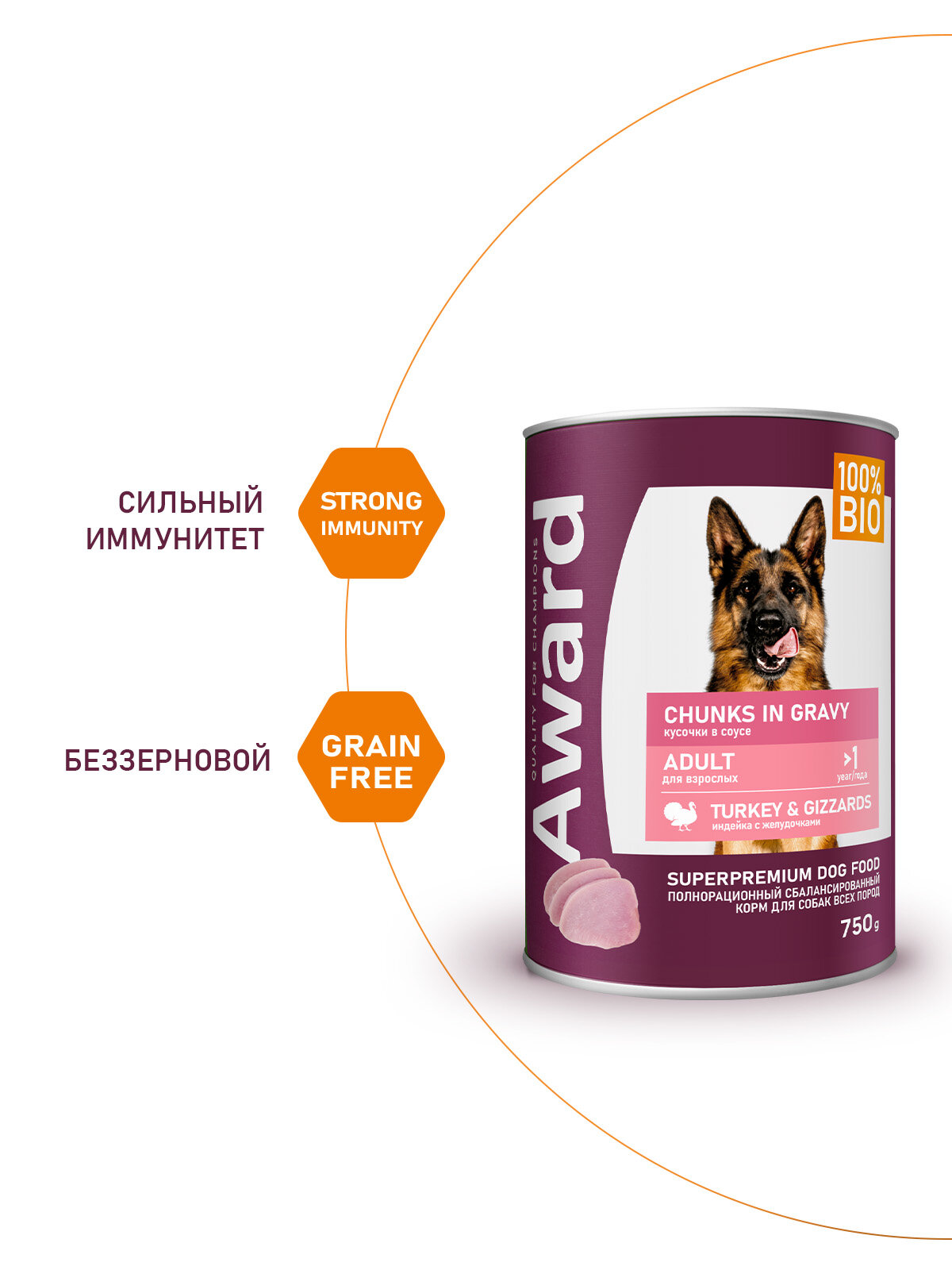 Корм для собак Влажный корм AWARD для взрослых собак кусочки с индейкой и желудочками в соусе 750г