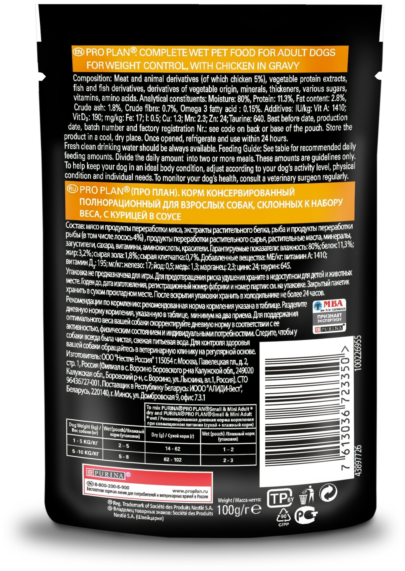 Purina Pro Plan (паучи) Паучи кусочки в соусе для взрослых Собак мелких пород с курицей контроль веса 12493543 0,085 кг 56232 (2 шт)