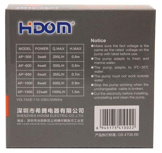 Аквариумные компрессоры и помпы Помпа фонтанная Hidom AP-600, 300 л/ч, 4 Вт