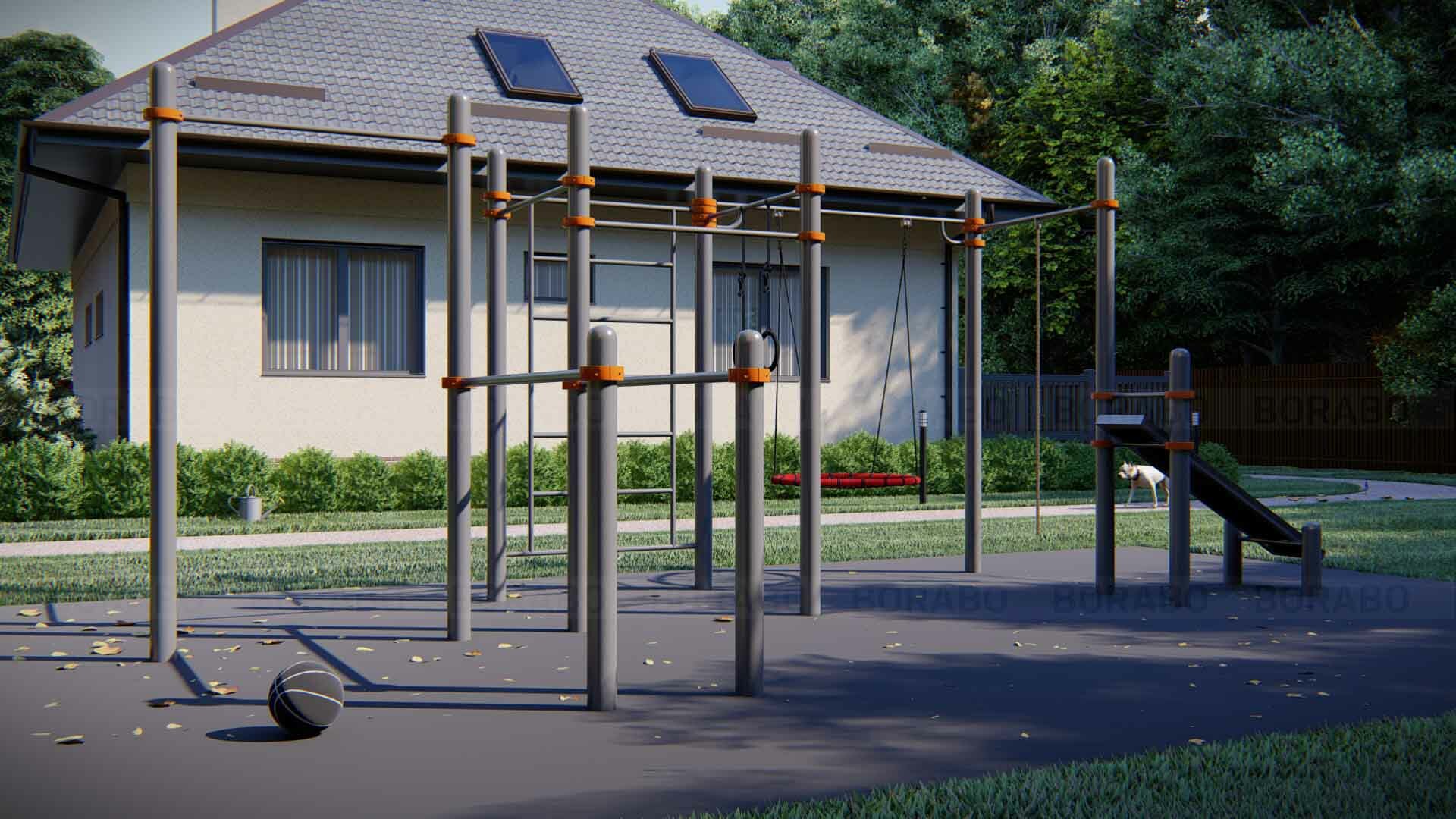 Игровые и спортивные площадки Игровая спортивная площадка для дачи Borabo с качелями, брусьями и скамьей для пресса, турниками и лестницей для взрослых и детей