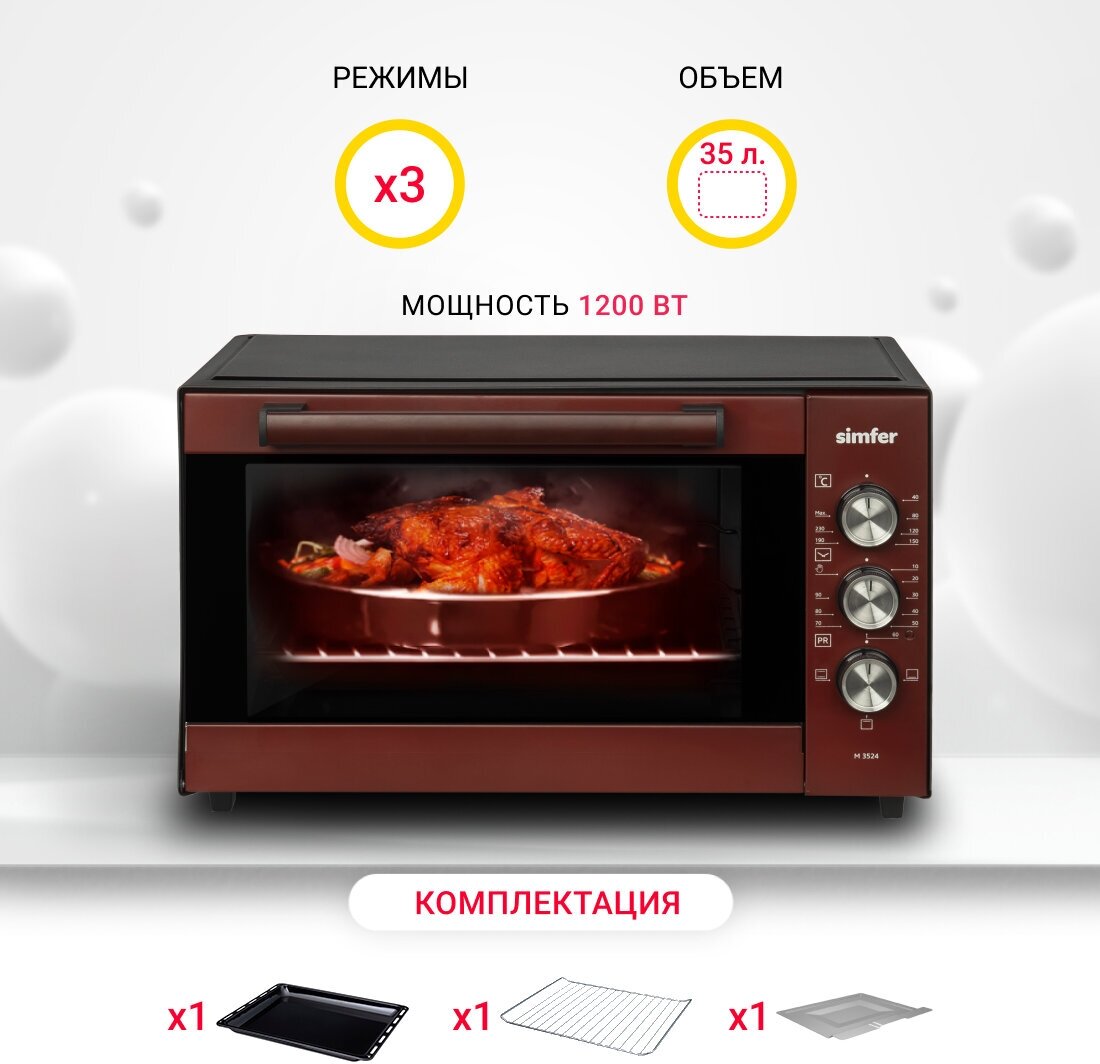 Лучшие цены. Характерной и отличительной «изюминкой» ростера Simfer выступает оригинальный дизайн, которые сочетает ярко-темный красный и традиционный черный цвет. Дополнительные декоративные детали выполнены в стиле «металлик». В остальном настольная электродуховка мало отличается от остальных моделей мини-печей от известного производителя из Турции из серии Classic. Она удачно сочетает компактные габариты, легкость, универсальность и возможность приготовить любое блюдо на выбор владельца. Магазины в вашем городе.