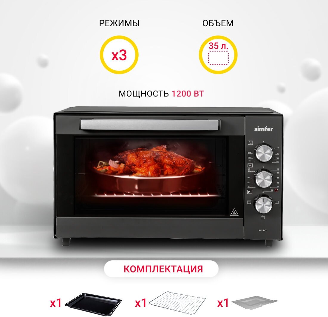 Лучшие цены. Ростер Simfer М3510 относится к модельной серии Classic. Он представляет собой компактную настольную электродуховку, функционал которой позволяет приготовить любые блюда – рыбные, овощные, мясные, выпечку и кондитерские изделия. Настолько обширный набор возможность обеспечивается наличием трех режимов готовки – с верхним, нижним и комбинированным (верхний + нижний) нагревом. Магазины в вашем городе.