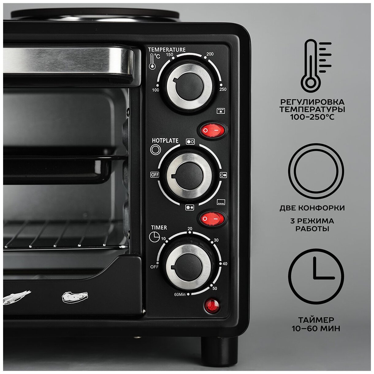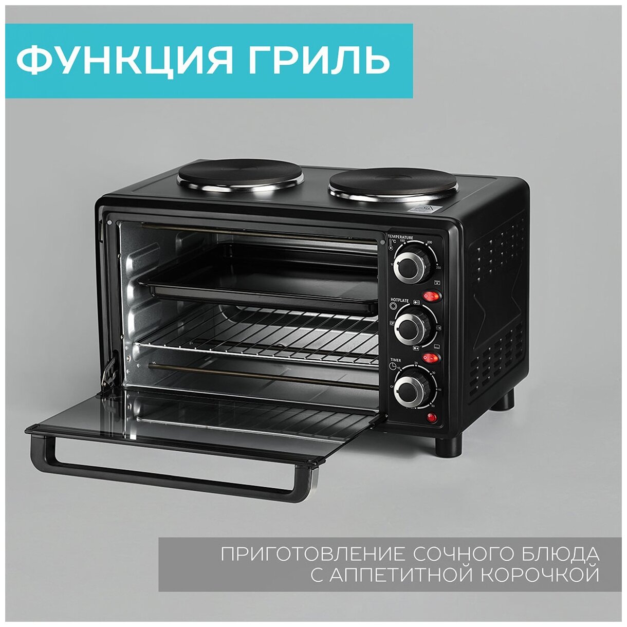 Лучшие цены. Электрическая печь SC-EO96O99 - прибор 3-в-1 электрическая и кухонная плита с 2 конфорками одновременно! SC-EO96O99 оснащена конвекцией, для равномерного распределения температуры, световым индикатором, таймером на 60 минут со звуковым сигналом. Прибор позволяет экономить место на кухне за счет расширенного функционала и наличия дополнительных конфорок. В комплект входят съемная решетка и поддон с покрытием из жаропрочной эмали. Магазины в вашем городе.