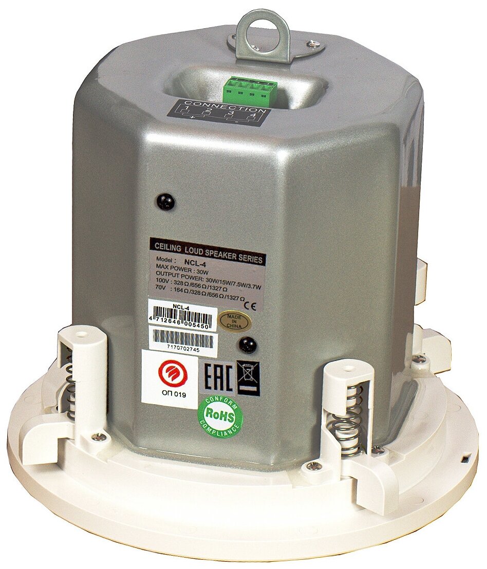 Лучшие цены. SHOW NCL-4 - 30 Вт потолочный громкоговоритель с надежной конструкцией, который идеально подходит для многочисленных инсталляций, как в общественных местах, так и в домашнем окружении. Являясь практичным и почти незаметным решением, он предоставляет мощный звук с точным воспроизведением и максимальной разборчивостью речи. 4" полипропиленовый вуфер и 3/4" твитер безупречно работают в 100 Гц – 20 кГц частотном диапазоне и прекрасно справляются с 86 дБ звуковым давлением. Магазины в вашем городе.