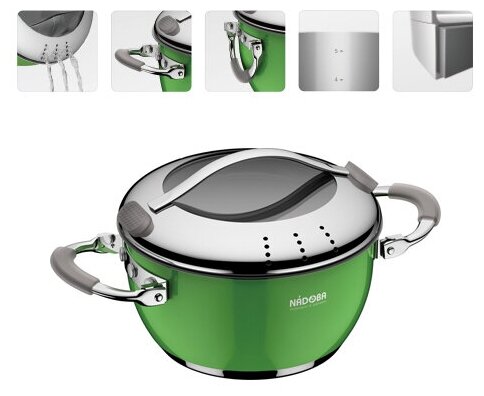 | Дополнительно | совместимость с индукцией, использование в духовке, отверстие для слива, многослойное дно, шкала литража |