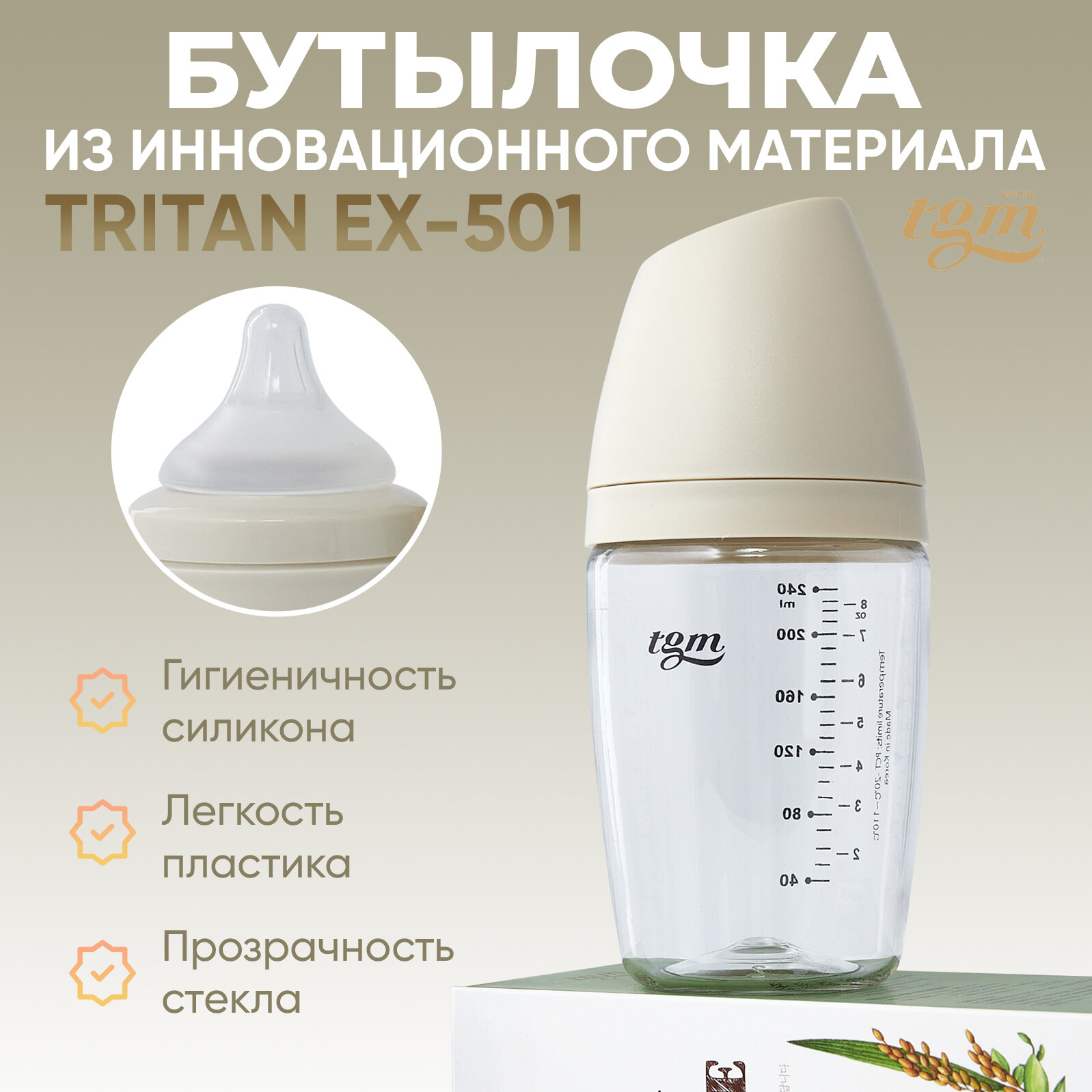 Бутылочки и поилки Бутылочка для кормления TGM Rice Grain Tritan 240 мл rice beige