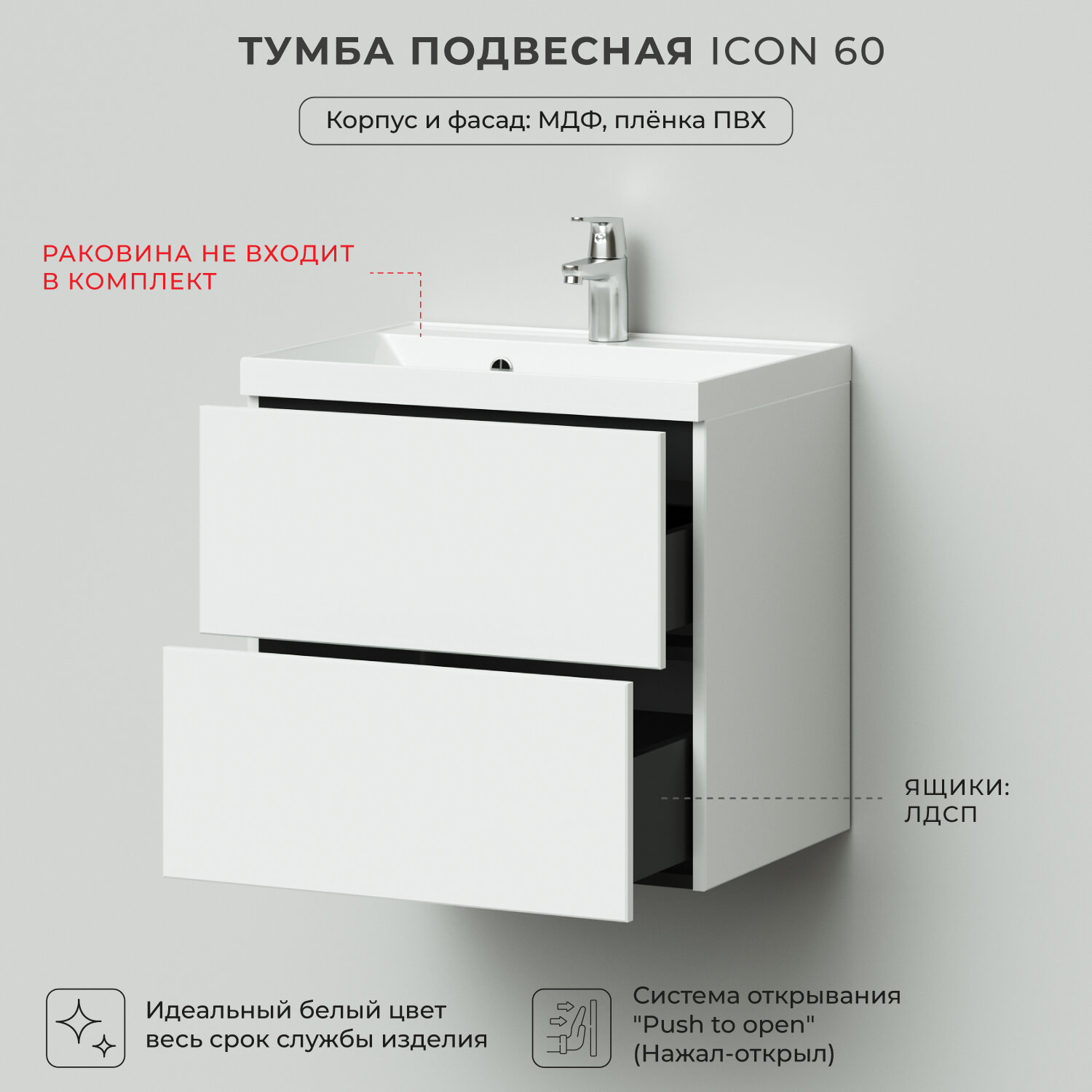 Тумбы под умывальник Tумба под раковину в ванную / Тумба для ванной Итана Icon 60 596х447х540 Белый глянец подвесная // под Умывальник мебельный Итана Clarissa 60