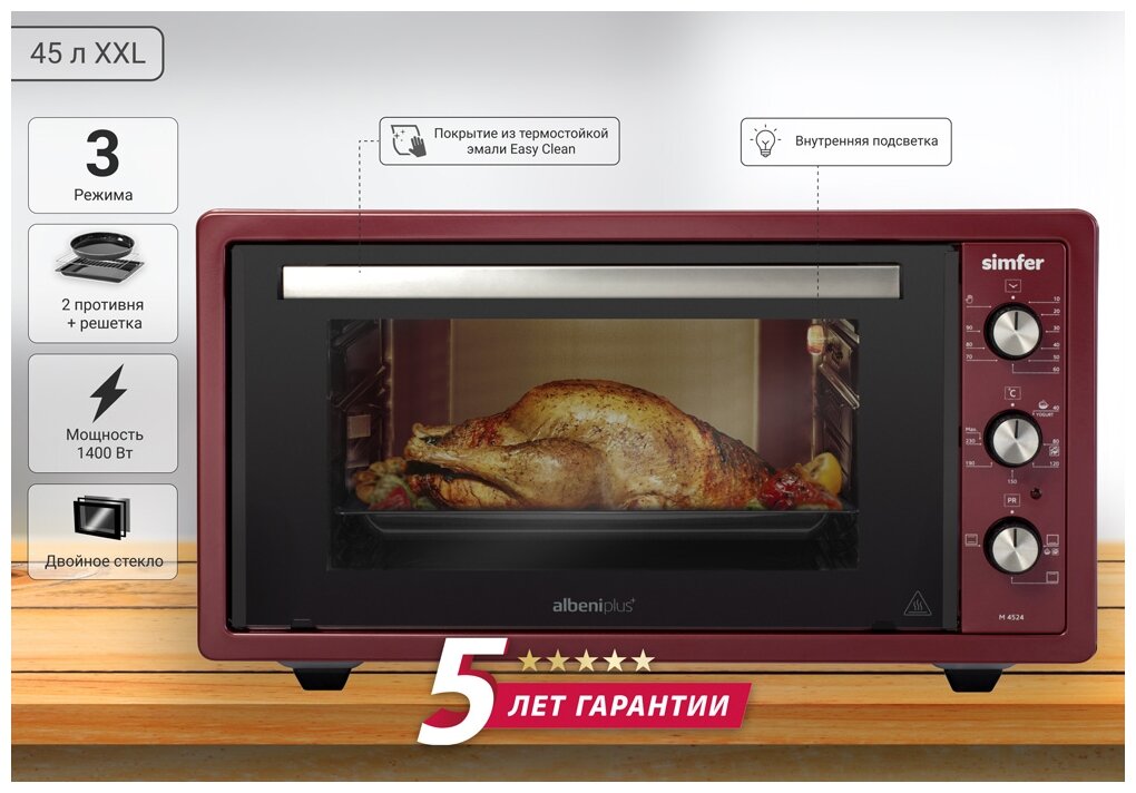 Мини-печь Simfer M4524 серия Albeni Plus Comfort, 3 режима работы, верхний и нижний нагрев