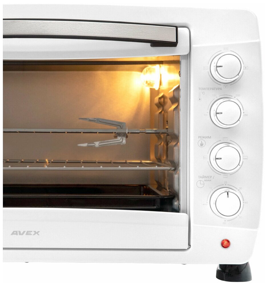 Лучшие цены. Вместительная электрическая мини-печь AVEX TR 450 WСL объемом 45 л и мощностью 2000 Вт позволяет идеально приготовить блюда в больших порциях. Компактная электропечь, благодаря своим небольшим размерам идеально вольется в обстановку, где необходимо сохранить максимум пространства, как на небольшой по площади кухне в городской квартире, или в загородном доме. Универсальный белый цвет и лаконичный дизайн помогут печи занять достойное место на кухне. Магазины в вашем городе.
