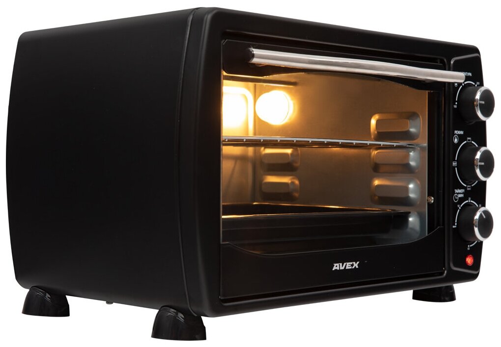 Лучшие цены. Настольная духовка AVEX TR 210 BL имеет довольно стильный внешний вид за счет классической формы и черного цвета. Такая мини-печь гармонично впишется в пространство кухни, т. к. она компактна и занимает мало места. Функциональность электропечи обеспечивают имеющиеся в комплекте противень, ухват и решетка для гриля. Камера изнутри имеет подсветку, чтобы можно было визуально наблюдать за готовящимся блюдом. Магазины в вашем городе.