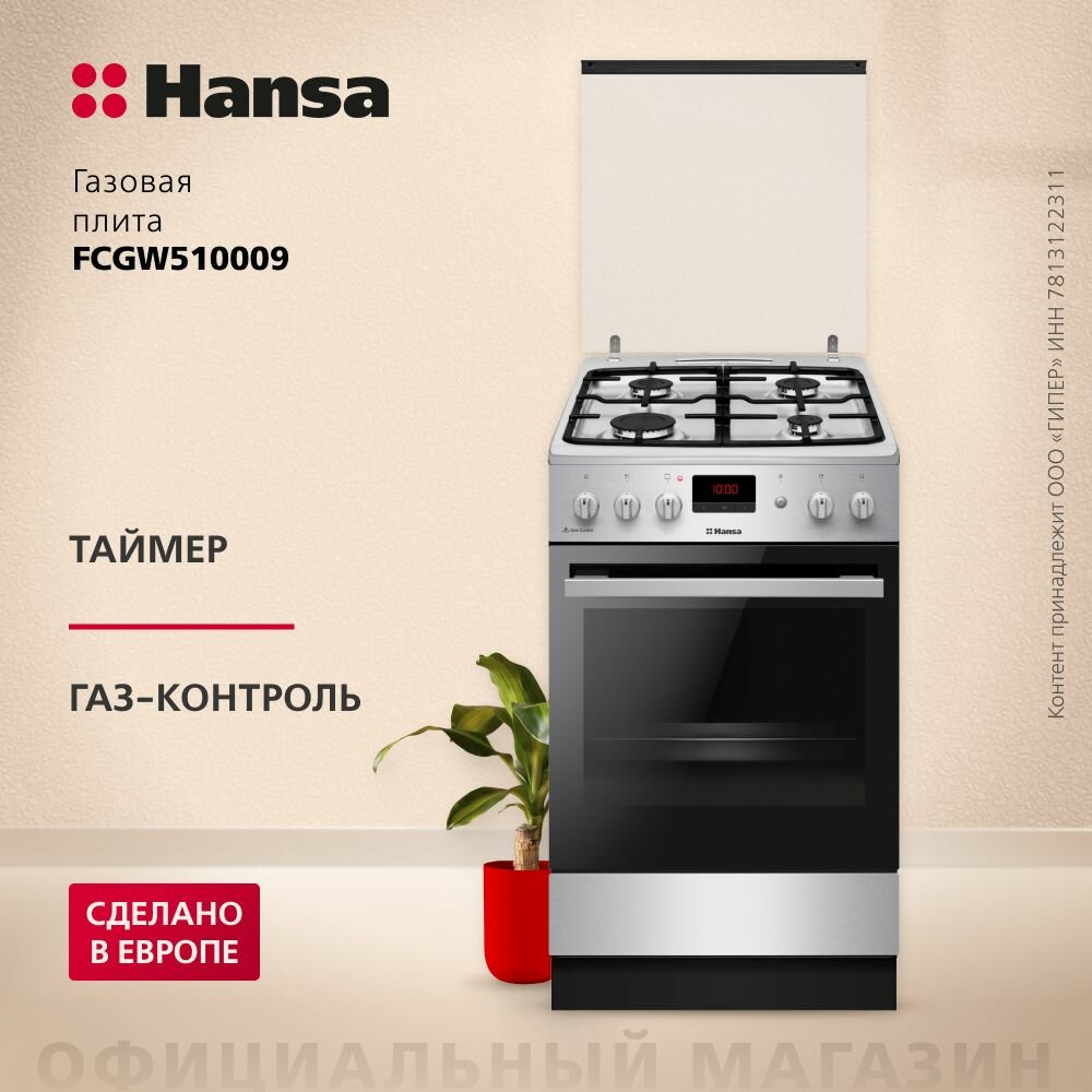 Плиты Газовая плита Hansa FCGX522222H, нержавеющая сталь, 70 л, 7400 Вт, гриль, электроподжиг, газконтроль, таймер