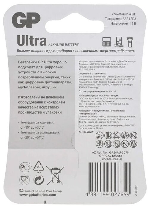 GP BATTERIES GP 24AU-CR2 ULTRA Батарейка алкалиновая GP Batteries Ultra Alkaline AAA 1,5V упаковка . GP 24AU-CR2 Ultra