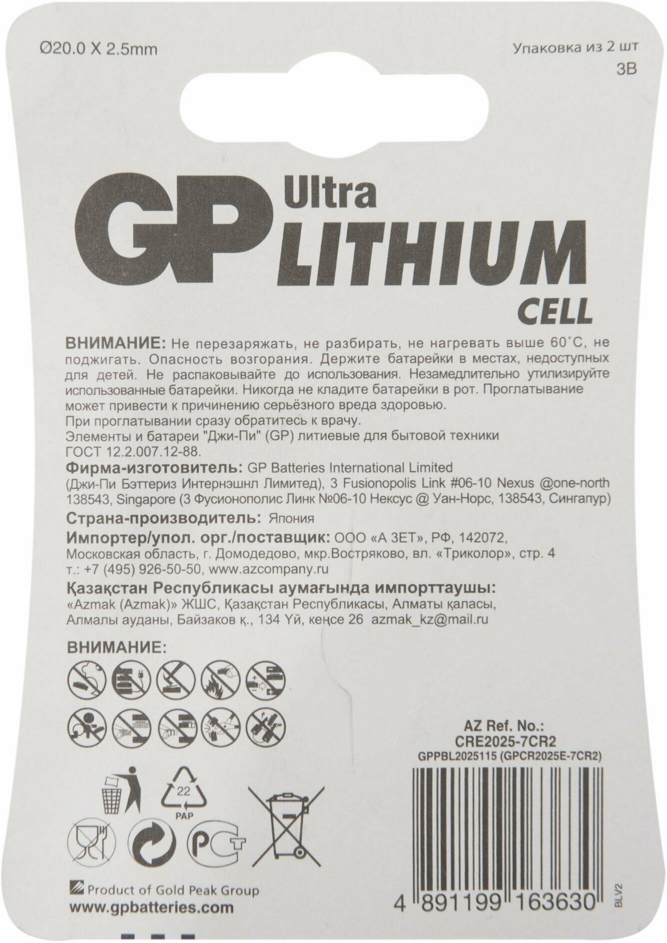 Аккумуляторы и батарейки Литиевые дисковые батарейки GP Lithium Ultra CR2025 - 2 шт. в блистере