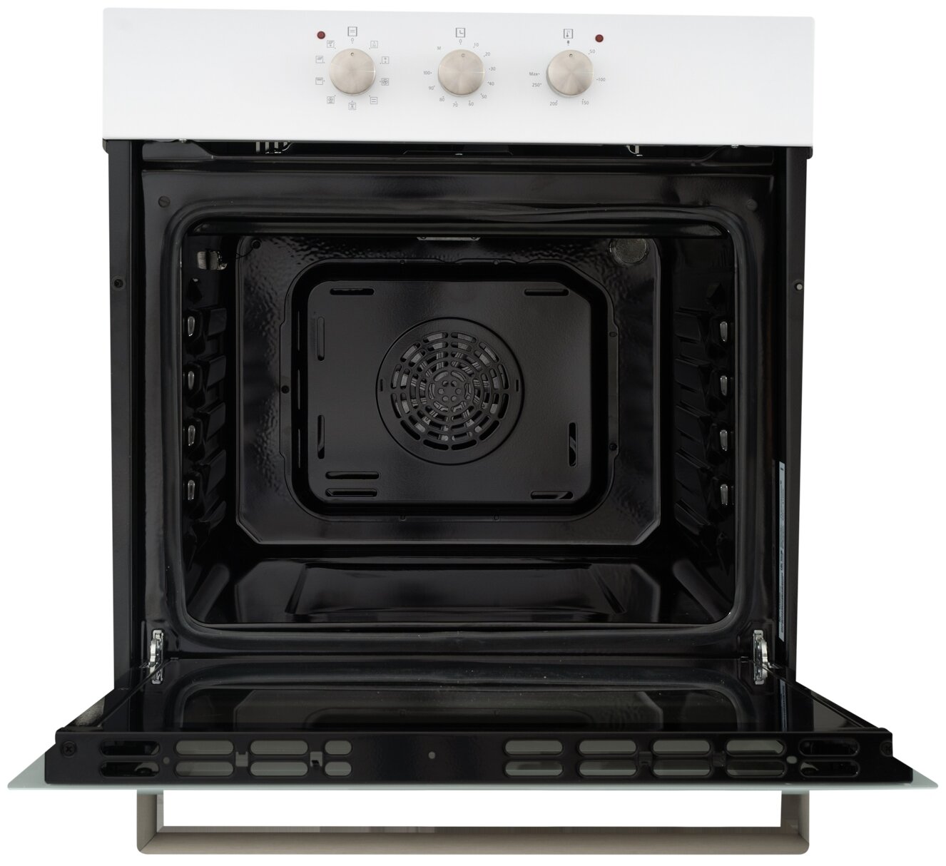 Духовой шкаф 59.5х59.5x61 см, 58л, 9 режимов работы, механические переключатели, механический таймер, белая эмаль/ручки цвета нержавеющая сталь