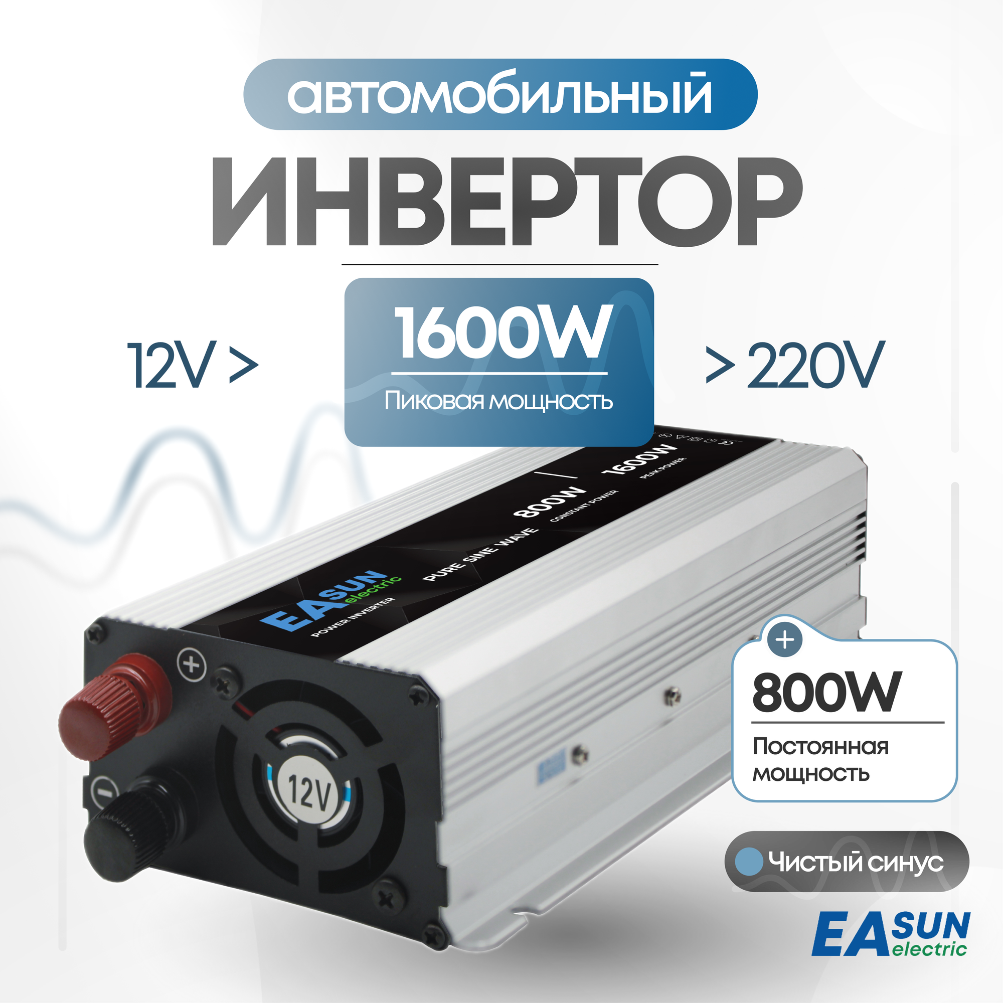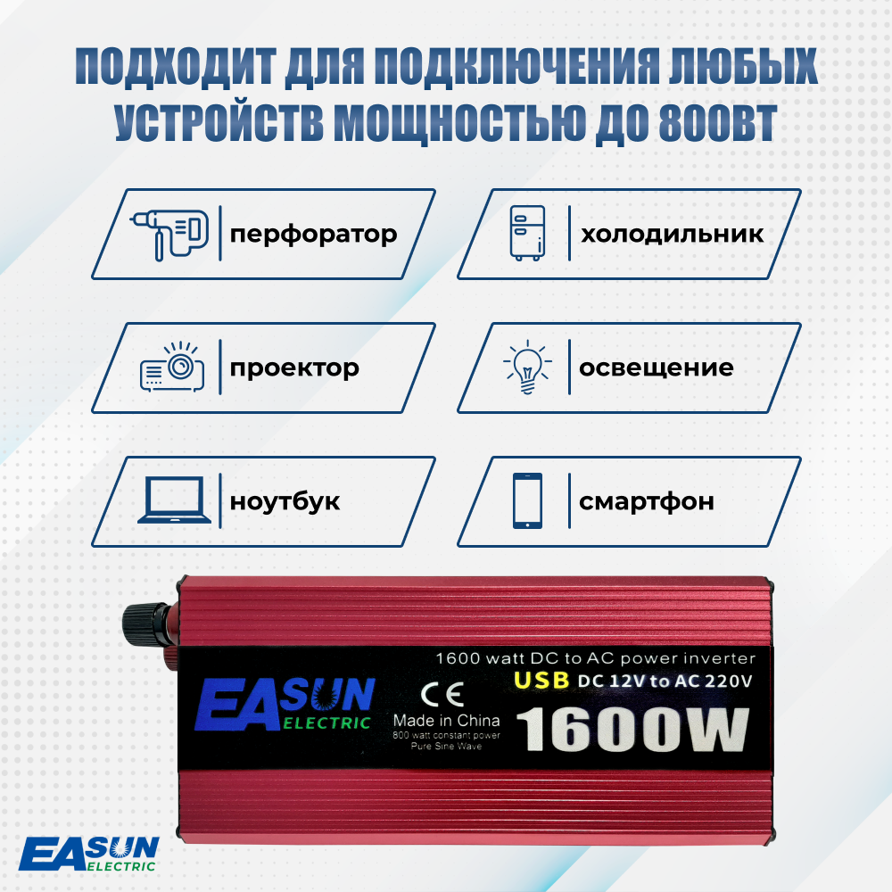 Автомобильные инверторы Автомобильный инвертор 12 220В, 1600 Вт. Чистый синус. Подключение к прикуривателю и АКБ. Евророзетка, USB. Постоянная мощность до 800 Вт.