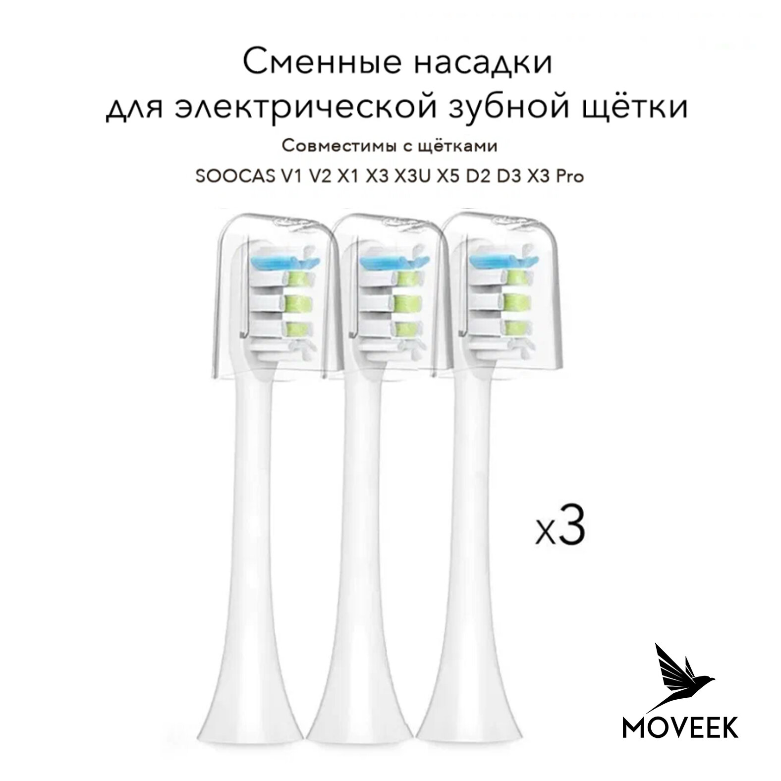 Насадки для зубных щеток Комплект из 3-х насадок совместимые с ультразвуковой зубной щеткой Xiaomi Soocas, Сменные насадки для электрических зубных щеток V1/X1/X3/X3U/X5 белого цвета