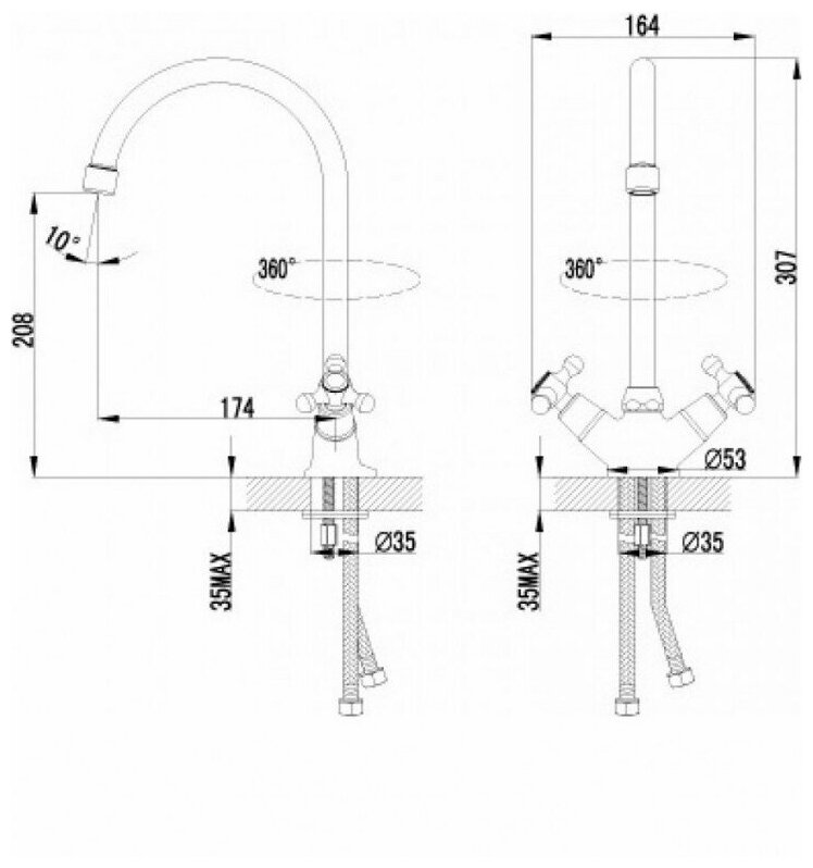 Лучшие цены. Смеситель для кухонной мойки. Длина излива: 17.4 см. подводка 1/2". хром. латунь. Управление: вентильное. керамическая кран-букса. Выдвижной излив: нет. поворотный излив- Описание Двухвентильный смеситель с классической формой излива дополнит любой современный интерьер кухни. Каждая хозяйка останется довольна работой этого изделия, оснащенного кран-буксой - внутренним механизмом, смешивающим горячую и холодную воду с помощью двух керамических пластин. Магазины в вашем городе.