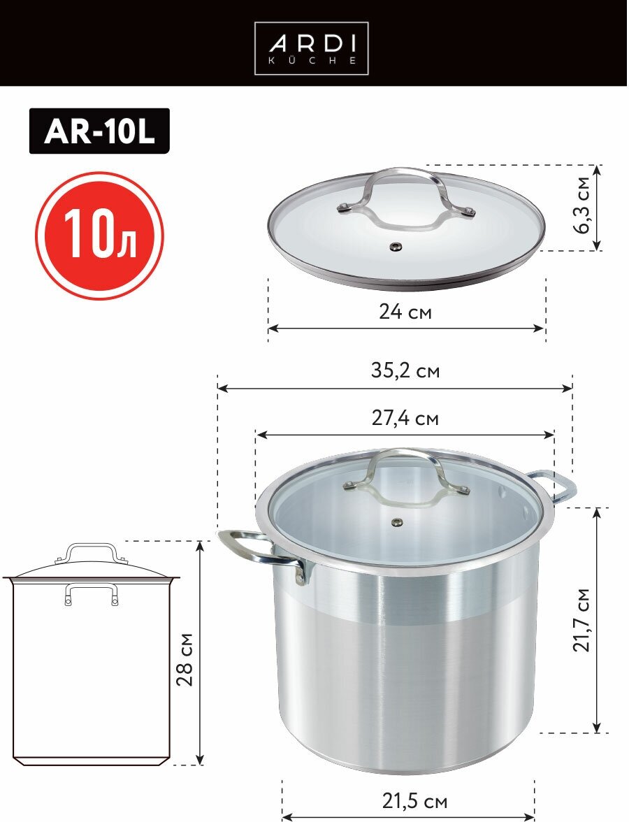 Кастрюли Кастрюля ARDI KUCHE AR-10L, 10 л, из нержавеющей стали со стеклянной крышкой, 24×21 см