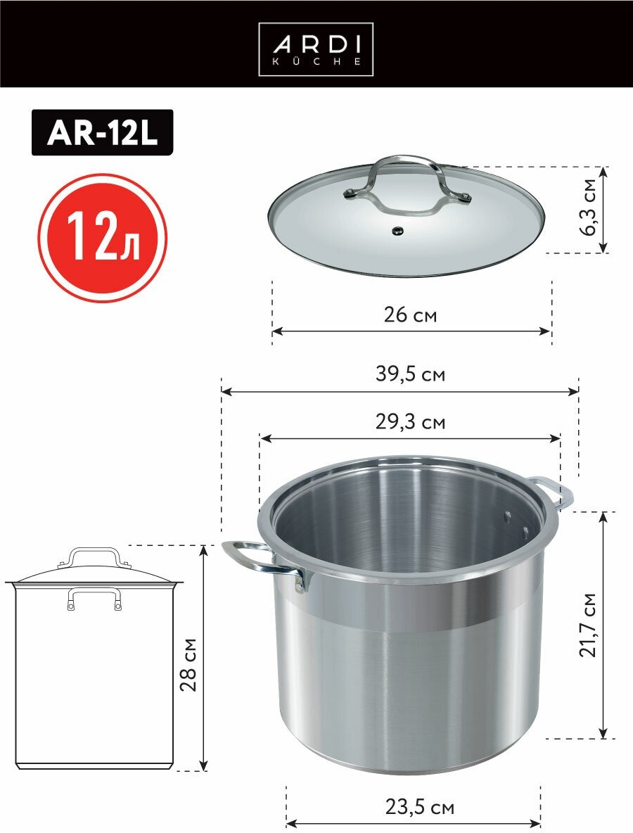 Кастрюли Кастрюля ARDI KUCHE AR-12L, 12 л, из нержавеющей стали со стеклянной крышкой, 26×22 см