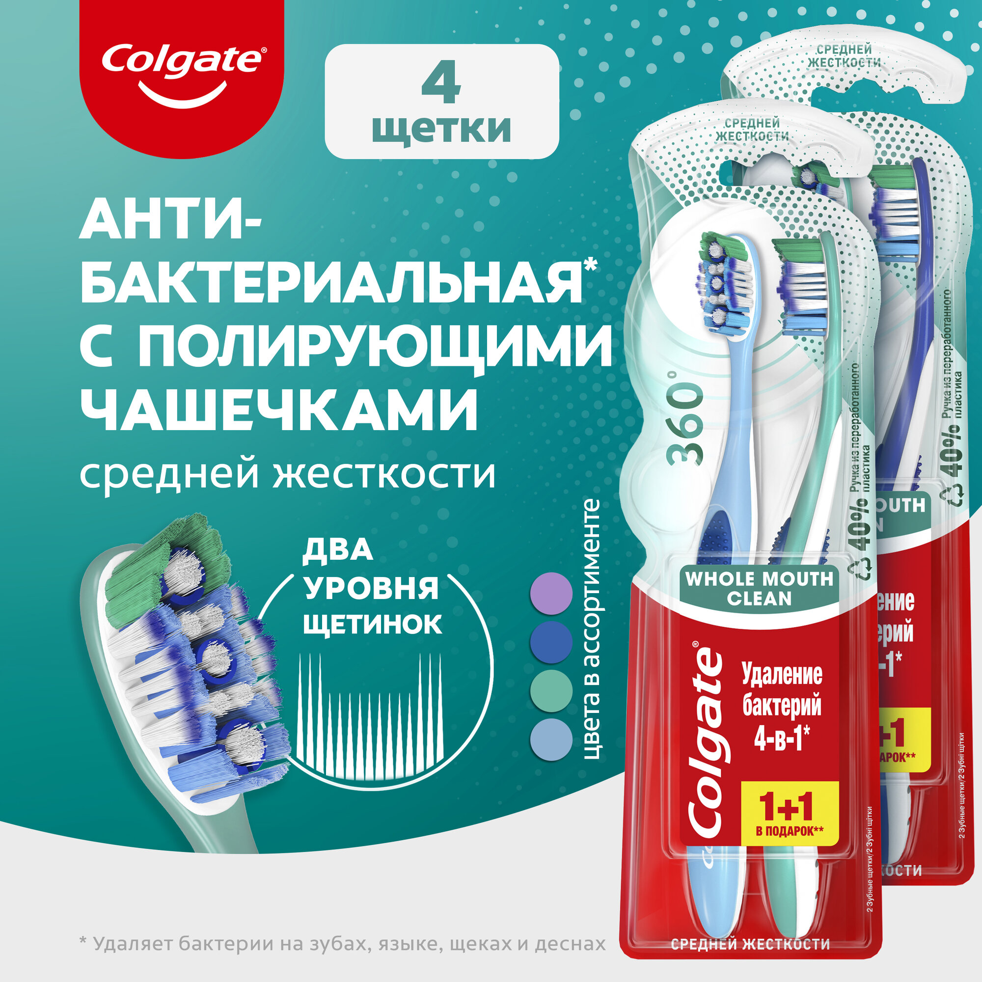 Электрические зубные щетки Зубная щетка Colgate 360º Суперчистота всей полости рта, антибактериальная, средней жесткости, промоупаковка 1+1 ( 2 шт )