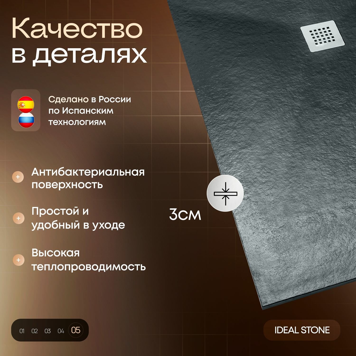 Поддон для душа из искусственного камня квадратный IDEAL STONE 90/90 серый 22 000 ₽ Подробнее