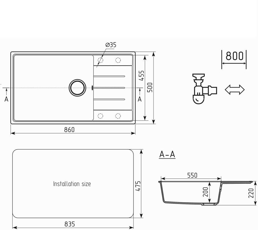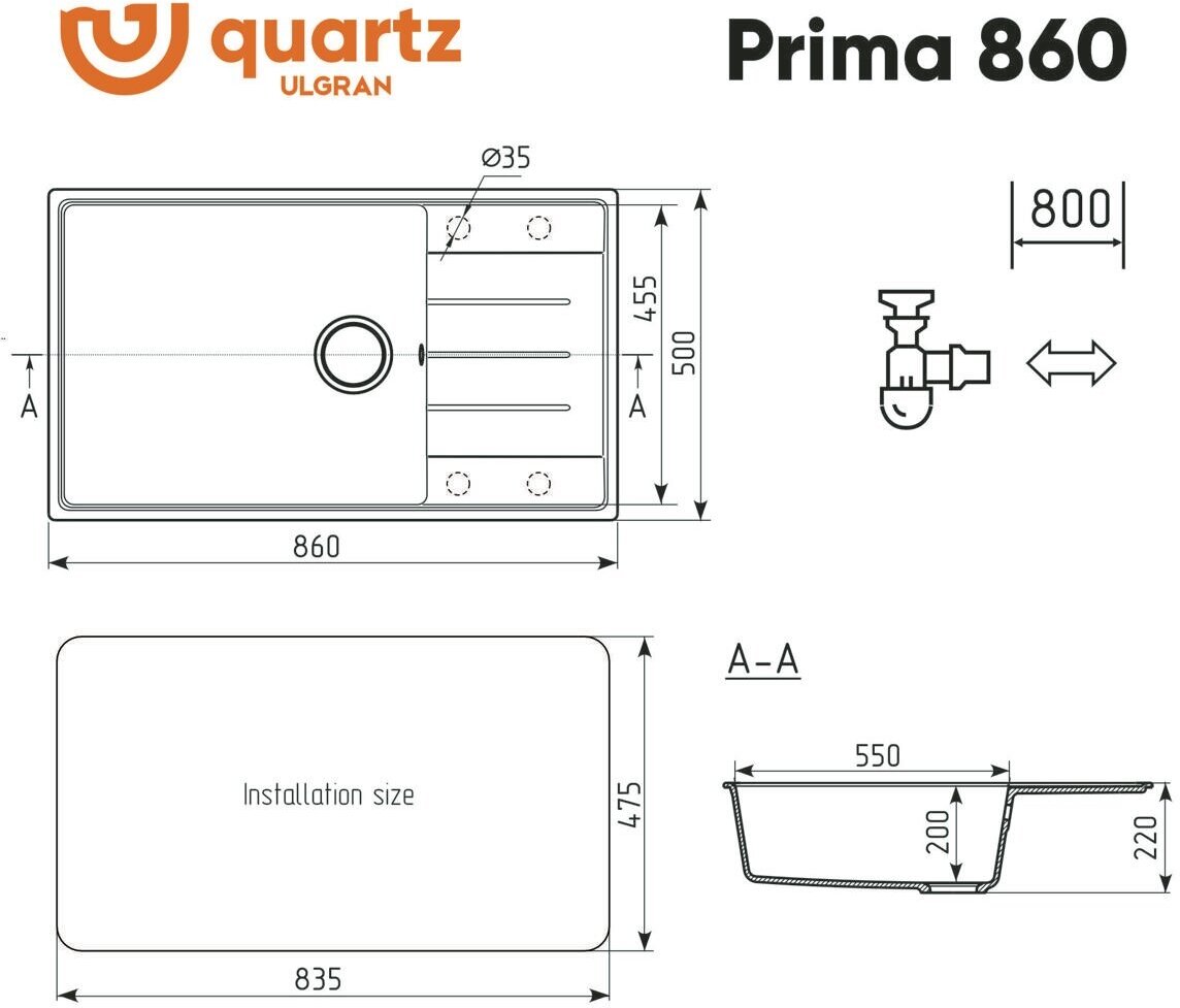 Мойка Ulgran, мрамор, U-400-309, (750*495*200 мм), темно-серый, сифон и сливная арматура