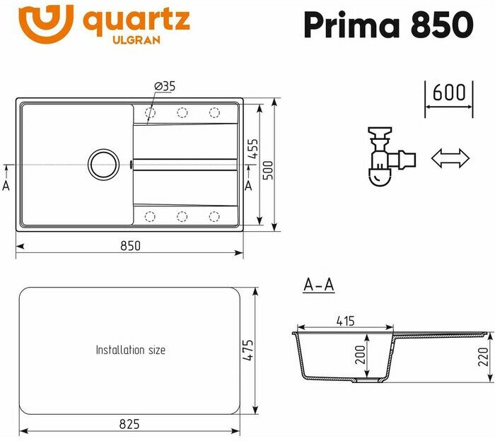 Мойка Ulgran, мрамор, U-400-309, (750*495*200 мм), темно-серый, сифон и сливная арматура