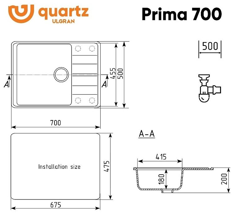 Мойка Ulgran, мрамор, U-400-310, (750*495*200 мм), серый, сифон и сливная арматура