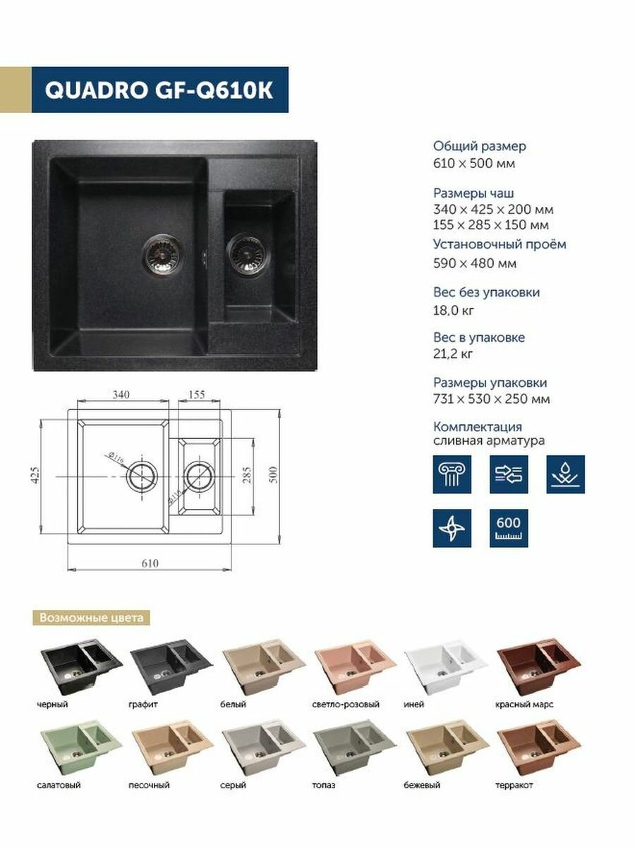 Кухонная мраморная мойка Granfest QUADRO GF-Q610K, 1,5-чашевая, прямоугольная, оборачиваемая, 610*500 мм, цвет графит/Раковина для кухни 8 921 ₽ Подробнее