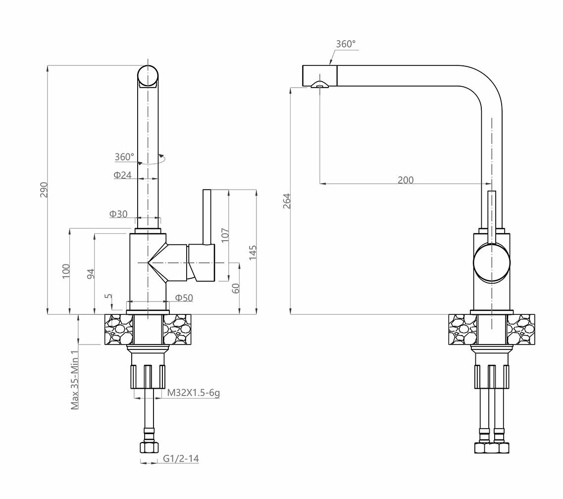 GRANFEST Смеситель для кухни боковой D-35мм(серый) 310