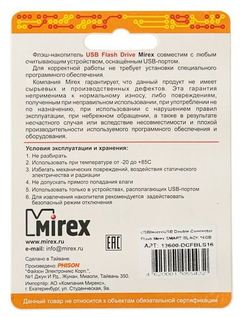 Флешка Mirex SMART BLACK, 16 Гб, USB2.0, USB-microUSB, чт до 25 Мб-с, зап до 15 Мб-с, черная 710 ₽ Подробнее