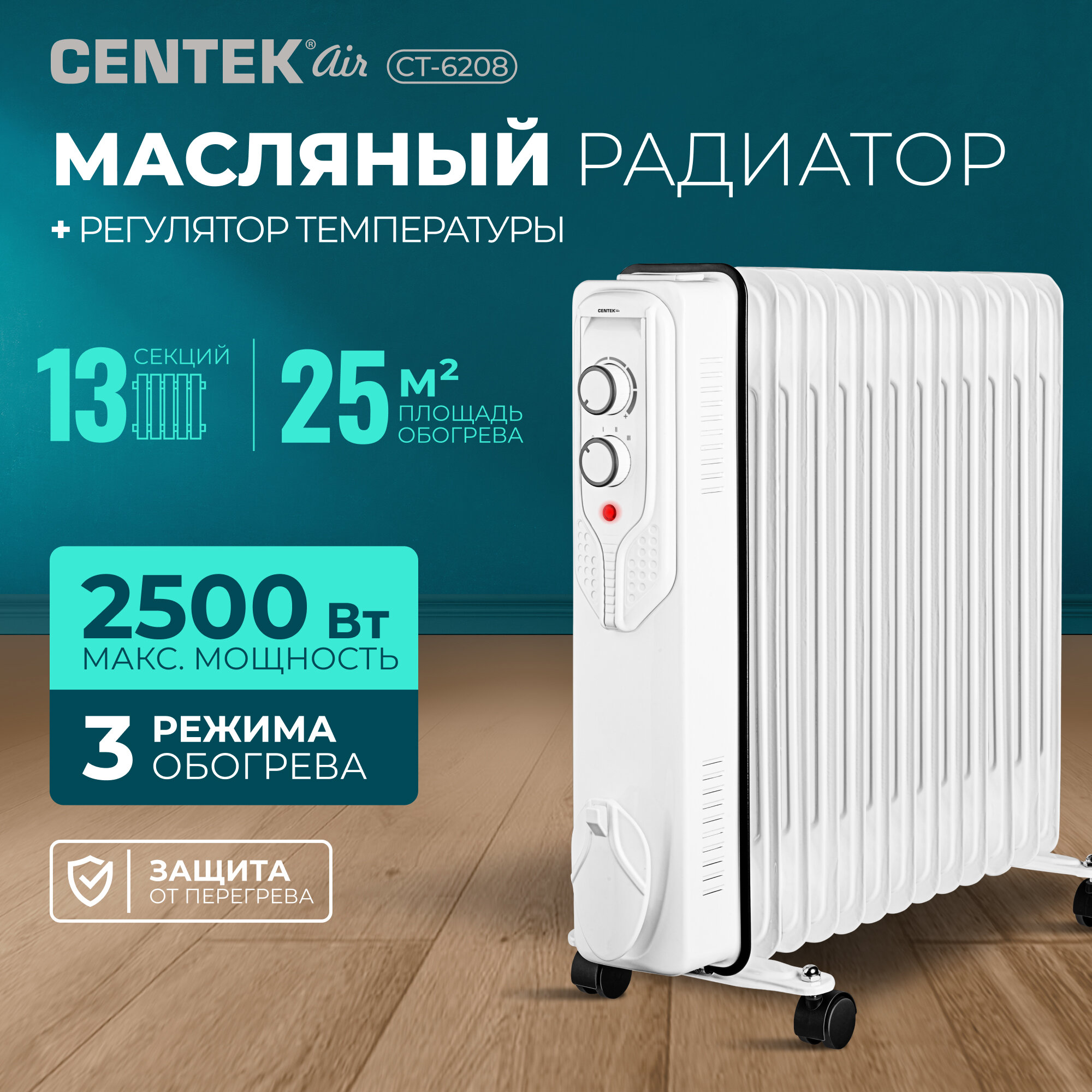 Уличные обогреватели Обогреватель электрический масляный CENTEK CT-6208: белый, 13 секций, 25м2, 2500Вт, 3 режима, защита от перегрева, терморегулятор, LED-индикатор