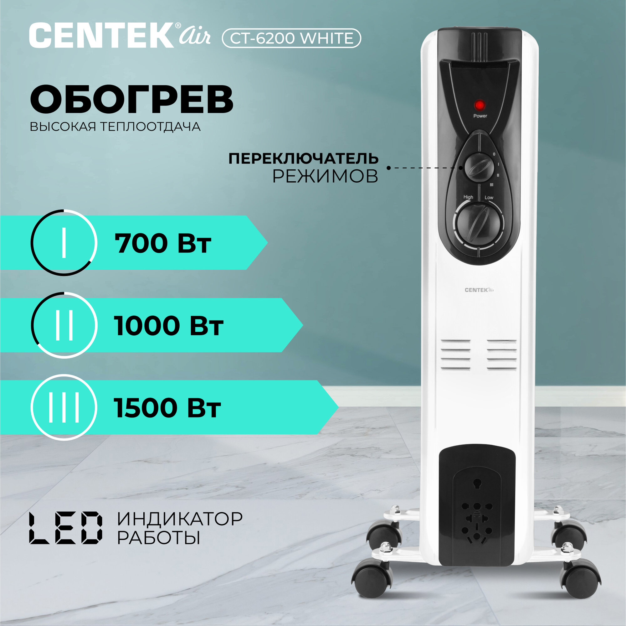 Уличные обогреватели Обогреватель электрический масляный CENTEK CT-6200: белый, 7 секций, 15м2, 1500Вт, 3 режима, защита от перегрева, LED-индикатор