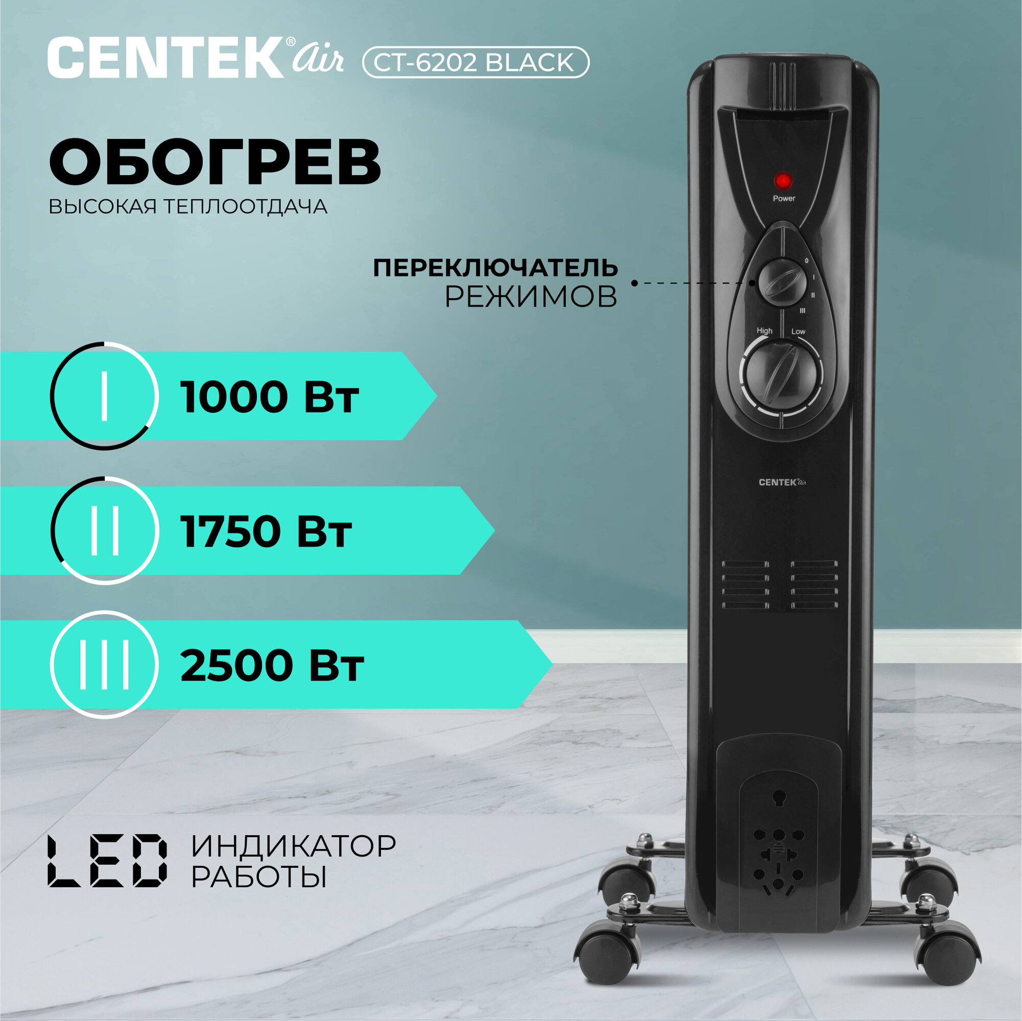 Масляный радиатор Обогреватель электрический масляный CENTEK CT-6202 Black: черный, 11 секций, 25м2, 2500Вт, 3 режима, защита от перегрева, LED-индикатор