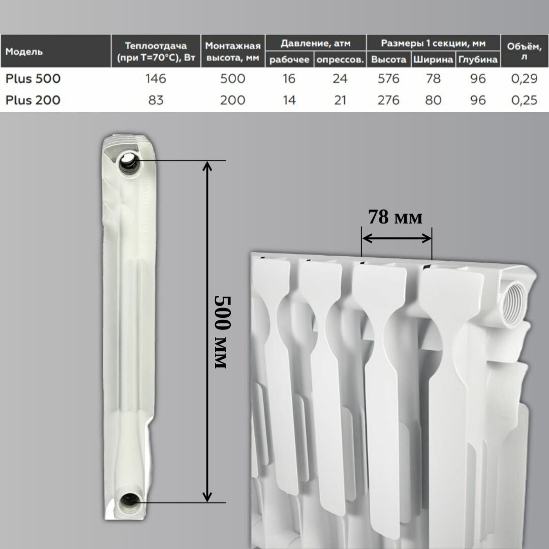 Радиаторы отопления Радиатор секционный алюминиевый Plus 500 8 секций параметры 576х624х96 боковое подключение